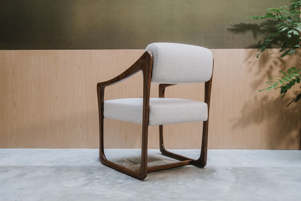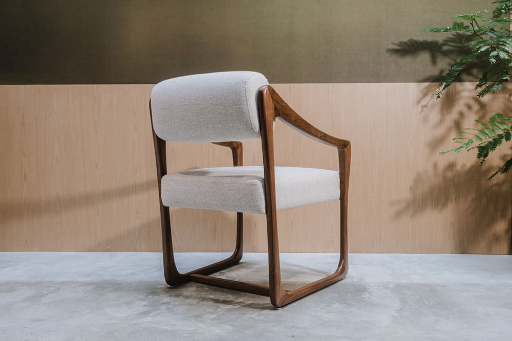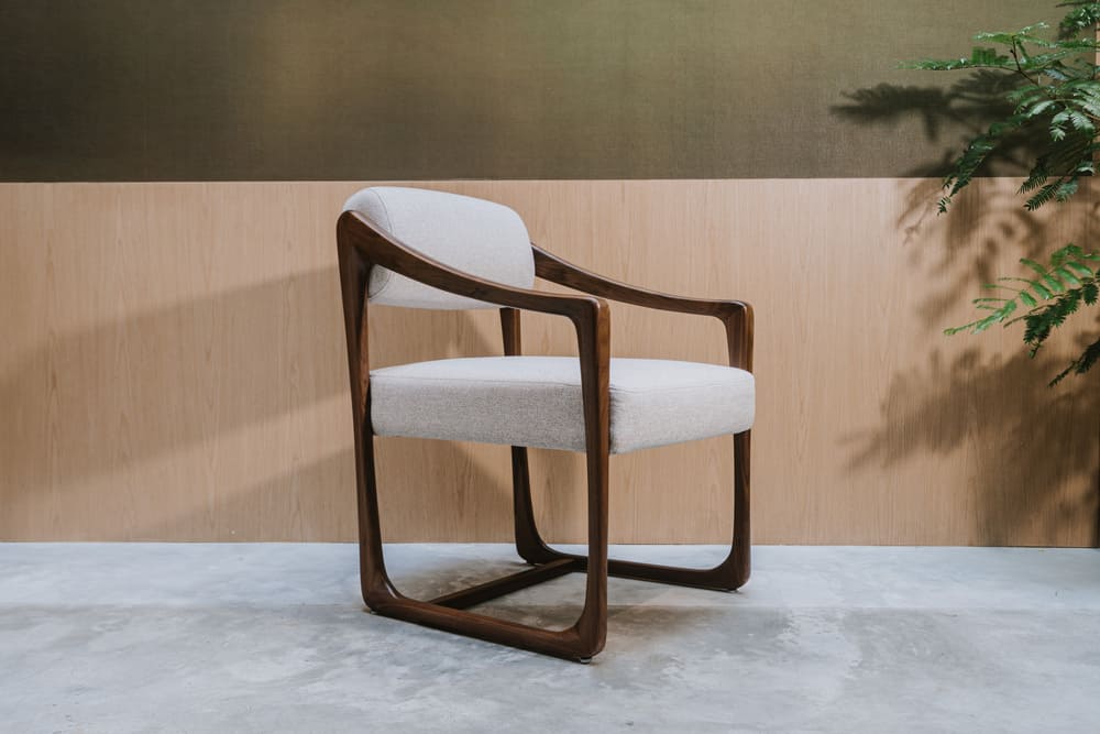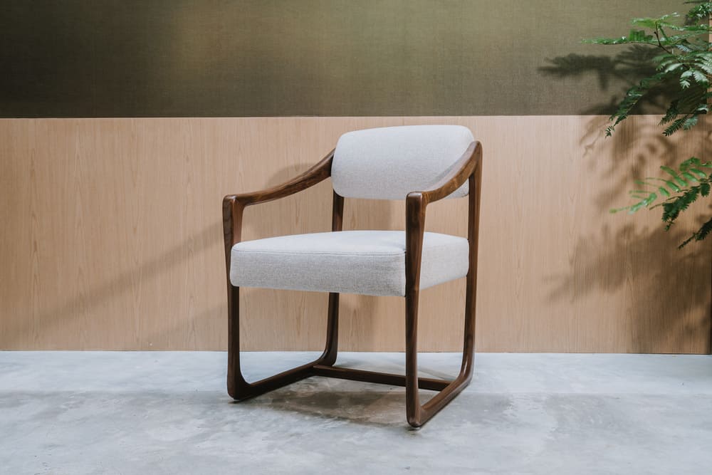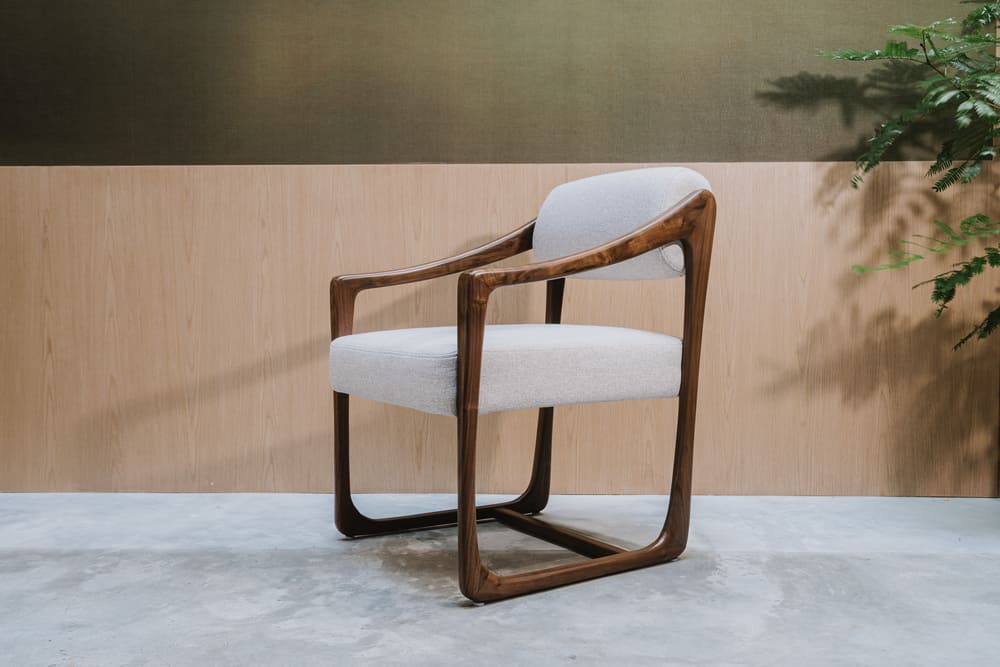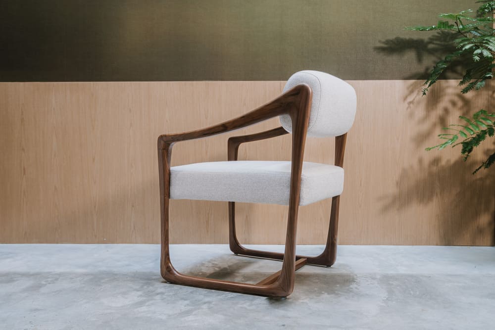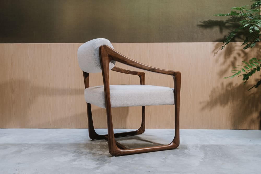 This chair is a refined blend of contemporary design and superior craftsmanship, made from solid ash timber finished in a luxurious walnut stain. Its distinctive curved armrests are both stylish and functional, offering a gentle slope that invites comfort while seamlessly integrating with the chair’s overall structure. The fluid lines of the armrests and frame create a harmonious aesthetic, making this chair a statement piece in any room.