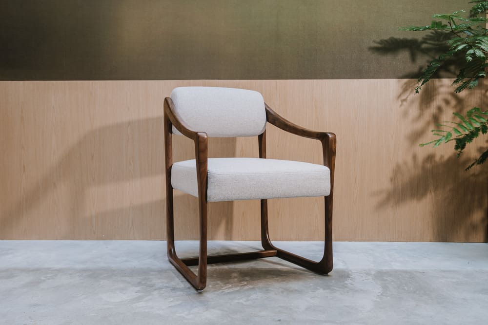 The chair features a unique cushion design, upholstered in an elegant off-white fabric that provides a subtle yet sophisticated contrast to the deep walnut tones of the wood. The cushion’s shape is thoughtfully crafted to offer ergonomic support, ensuring that it cradles the body comfortably while maintaining a clean, modern look. This choice of fabric not only enhances the chair’s visual appeal but also promises easy maintenance, making it a practical addition to any living or dining space.