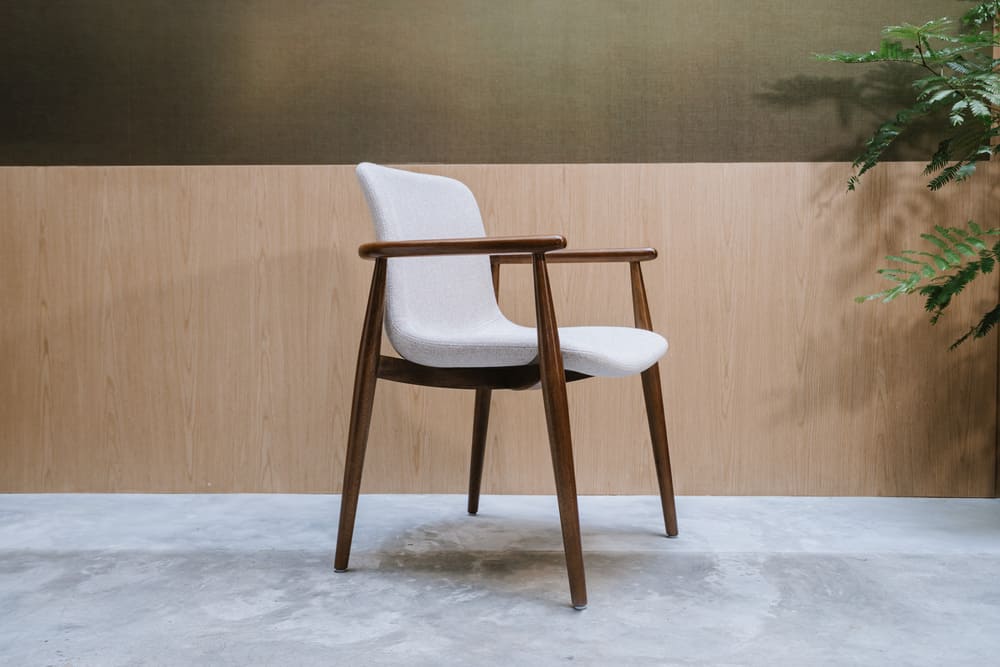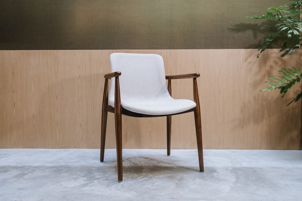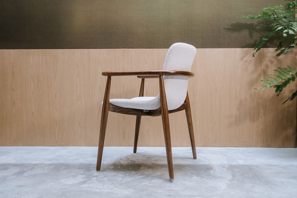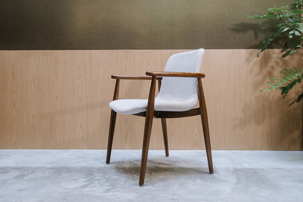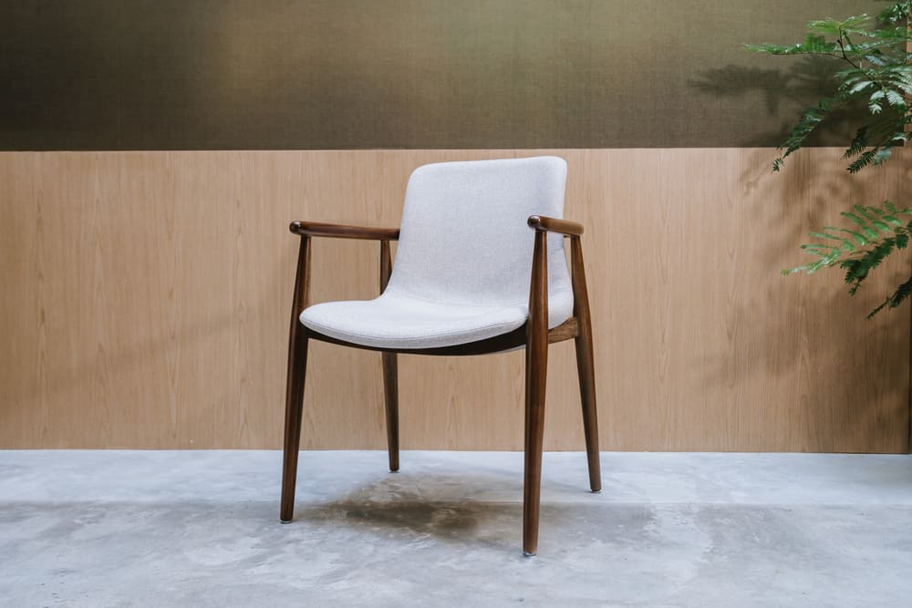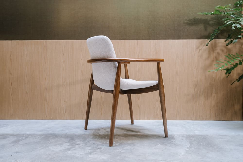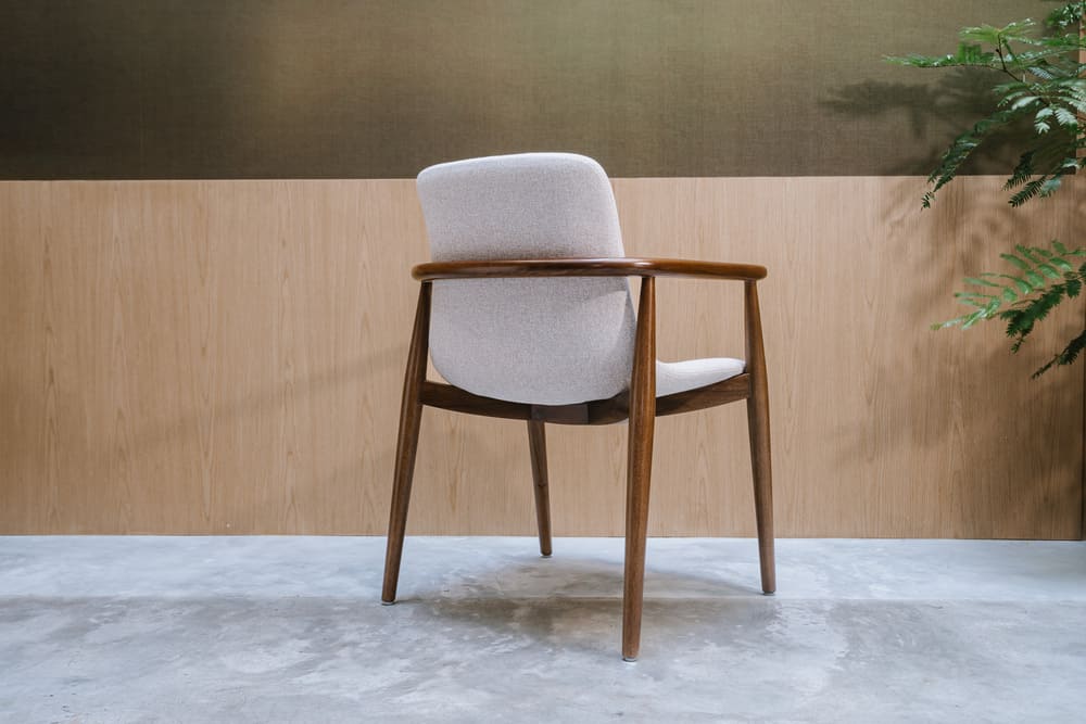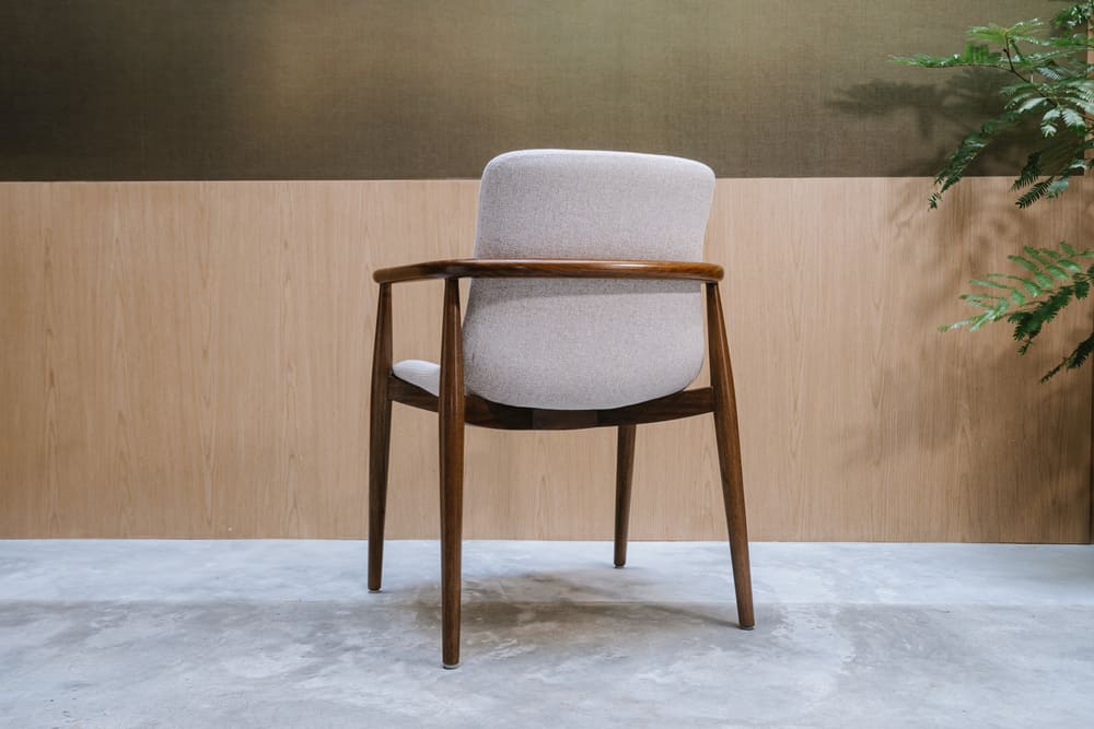 This chair seamlessly merges contemporary design with classic elegance, making it an excellent fit for both modern and traditional environments. Its sleek frame, crafted from solid ash timber and stained in a rich walnut tone, ensures both durability and a refined appearance. The backrest and seat are upholstered in a soft, light gray fabric that has been rigorously tested for durability, providing both comfort and long-lasting performance.
